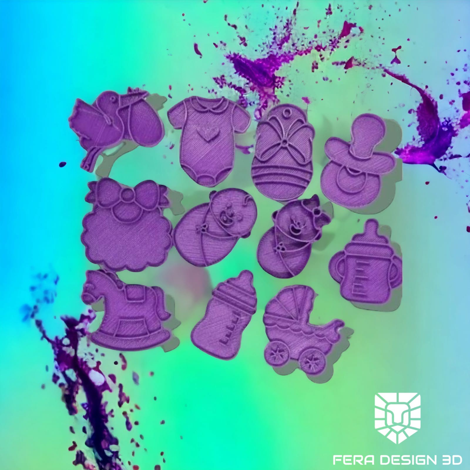Kit contém 11 cortadores e marcadores no tema Bebê: 1 cortador e marcador de Cegonha, 1 Body bebê, 1 chocalho, 1 chupeta, 1 babador, 1 bebê menino, 1 bebê menina, 1 mamadeira com alça, 1 cavalo balanço, 1 mamadeira sem alça e 1 carrinho de bebê.