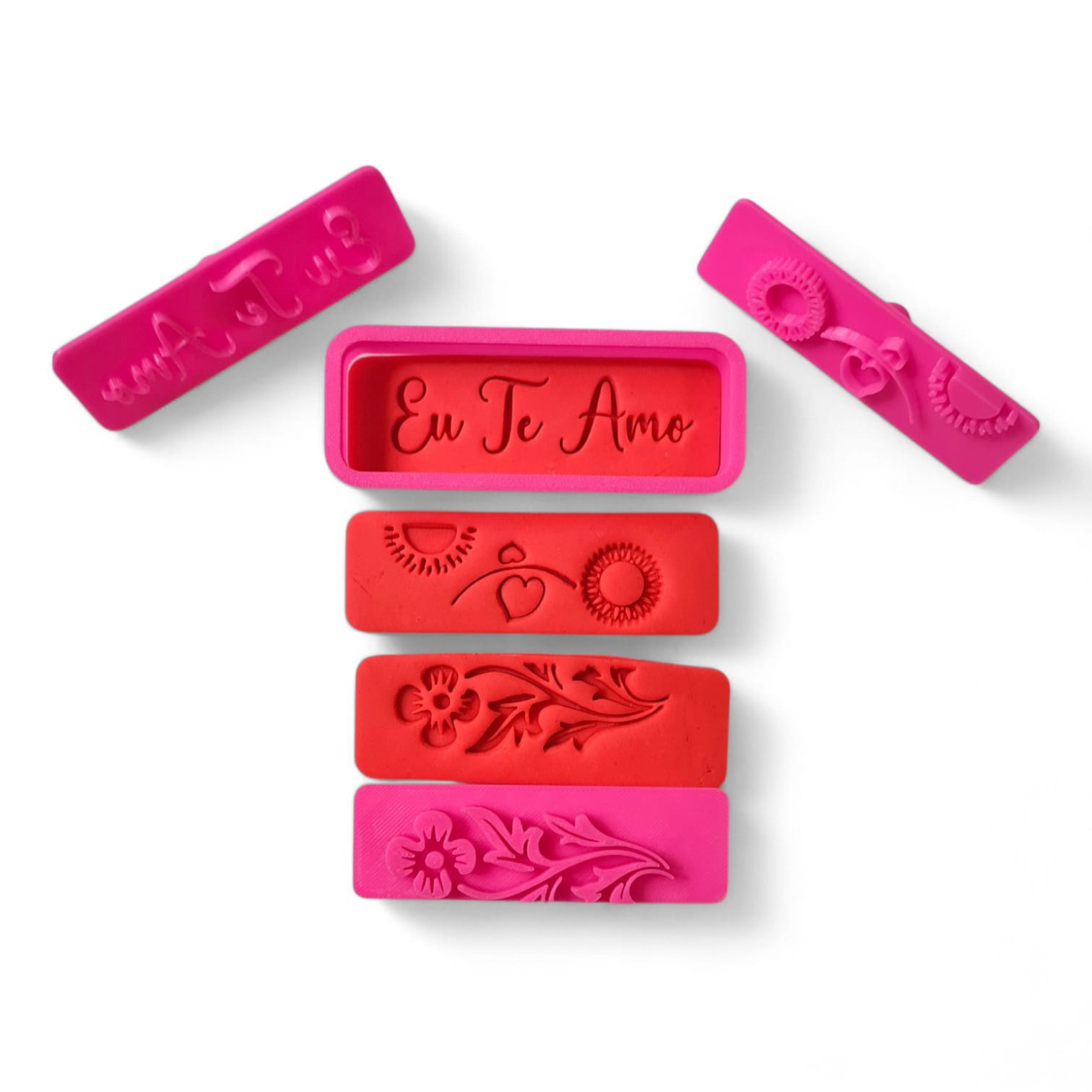 Kit completo: 1 Cortador Retangular, 3 carimbos: 1 escrito Eu te amo, e 2 nos temas de flores (Girassol e Margarida)