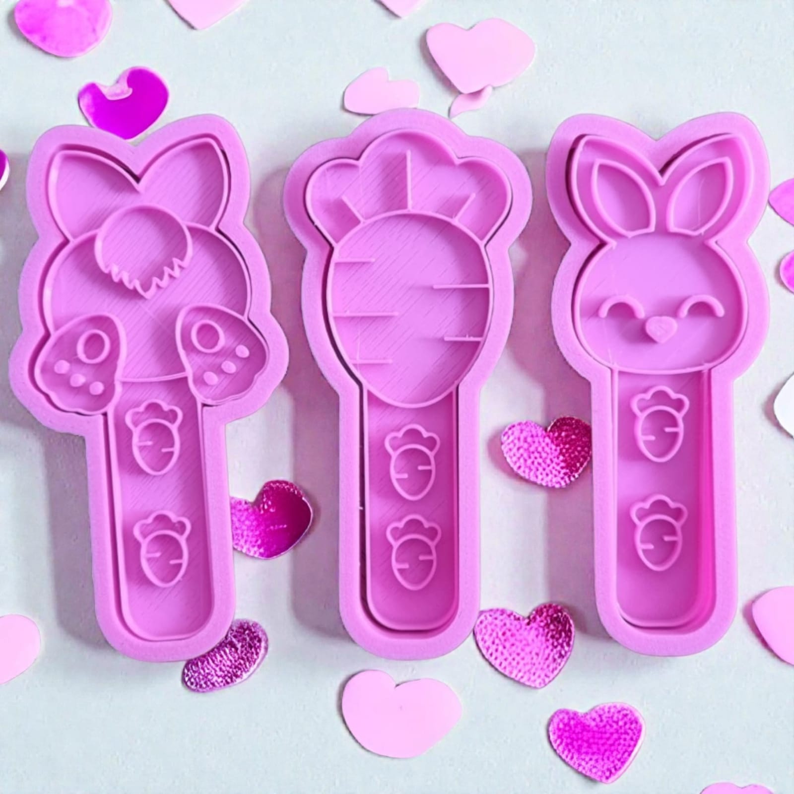 Kit completo contém: 3 cortadores e marcadores sticks, 1 de coelho, 1 de bumbum de coelho e 1 de cenoura